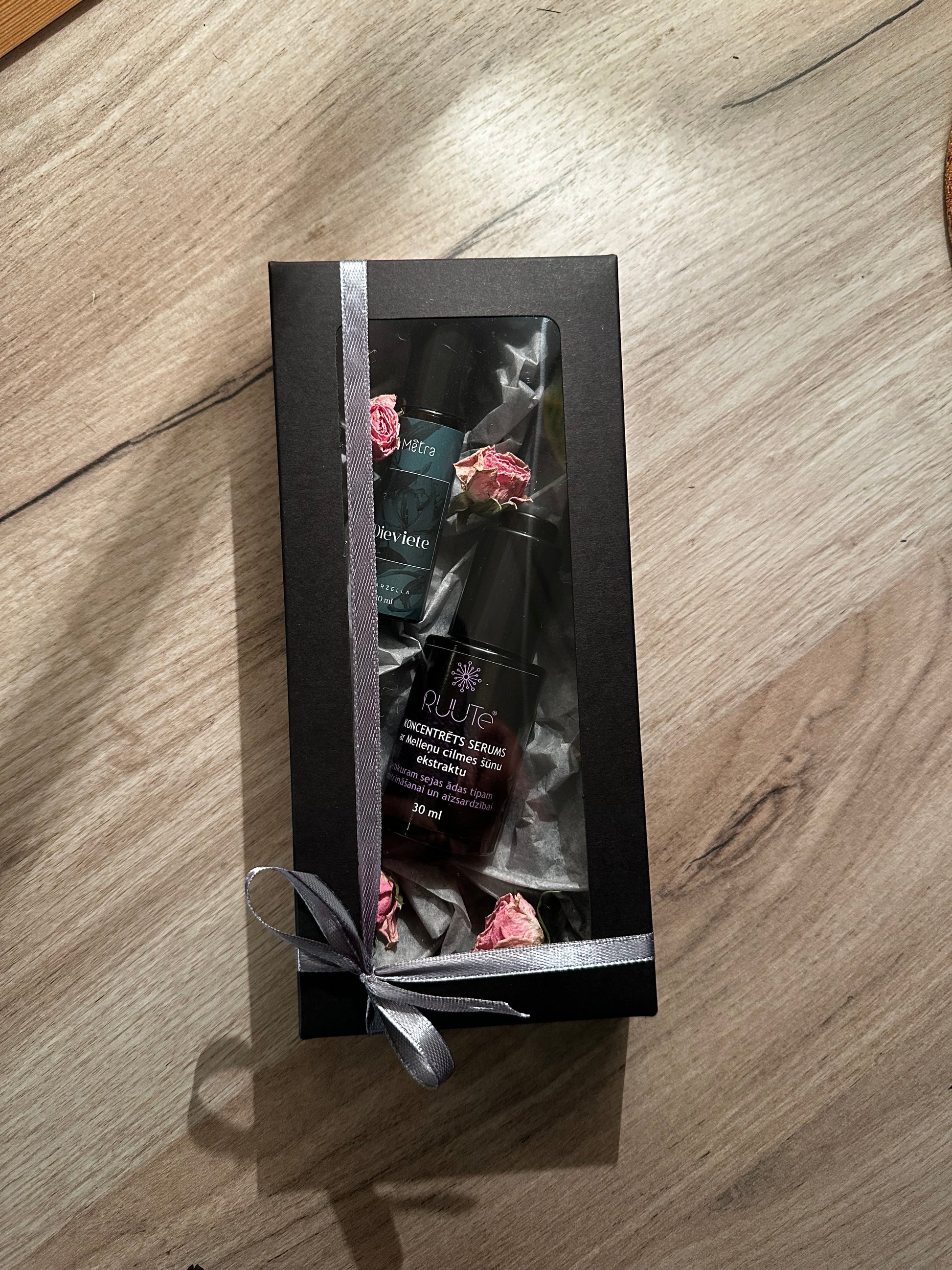 Komplektā ietilpst Smaržu rullītis Dieviete (10 ml) un Koncentrēts serums ar Melleņu cilmes šūnu ekstraktu (30 ml)